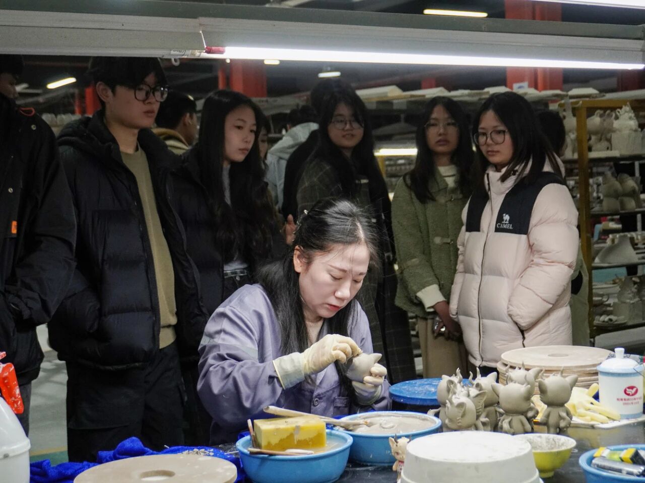 走進(jìn)生產(chǎn)區(qū),學(xué)生們目睹了陶瓷從原料成型到燒制出窯的全過(guò)程。在拉坯師傅的巧手下,器物線條愈發(fā)流暢;后又見(jiàn)證了操作員調(diào)色、施釉,在精細(xì)的操作中,坯體煥發(fā)出別樣光彩;以及于素胚之上巧運(yùn)靈思、妙筆生花的畫坯等工序后,企業(yè)技術(shù)人員還介紹了現(xiàn)代化生產(chǎn)設(shè)備如何與傳統(tǒng)工藝結(jié)合,提升生產(chǎn)效率與產(chǎn)品品質(zhì)。
